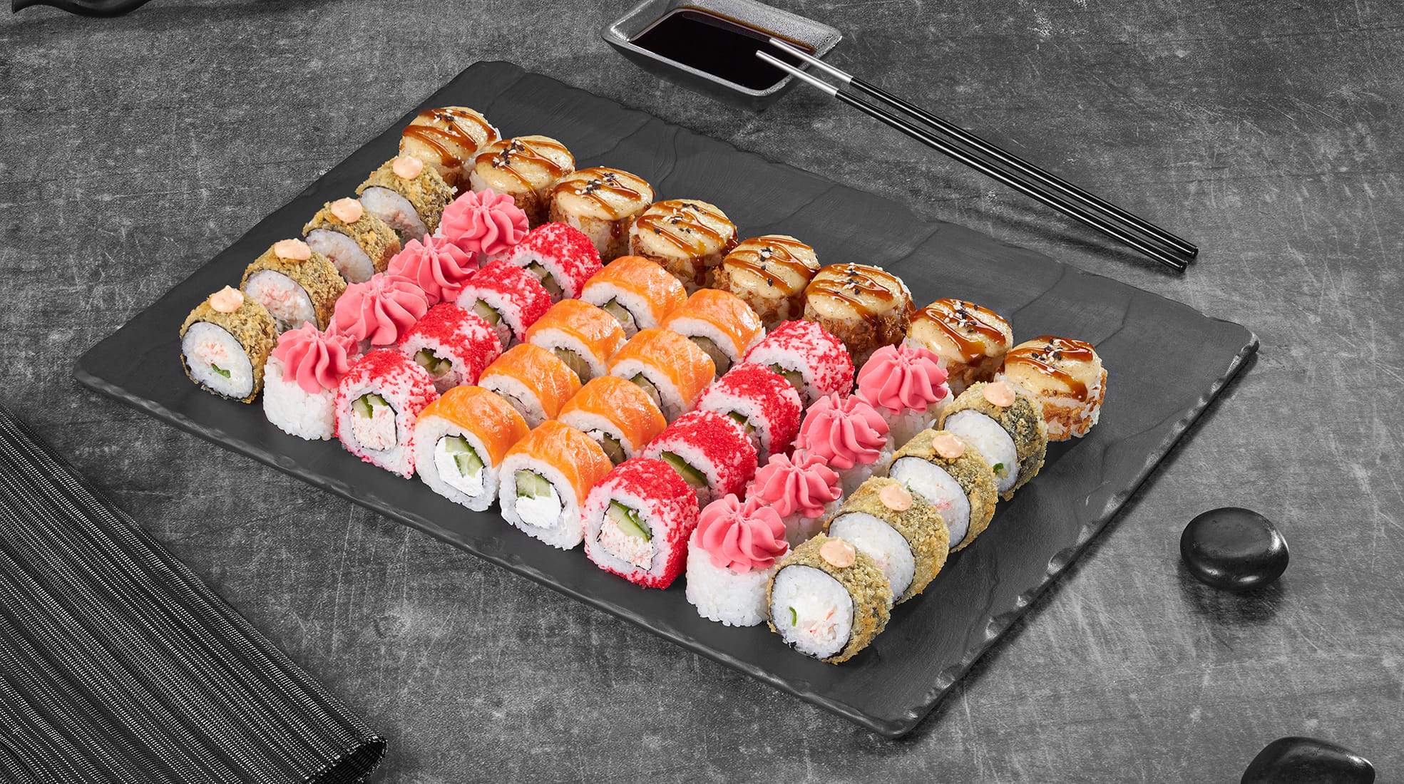 Филадельфия лайт сяке (8 шт.), Калифорния в кунжуте (8 шт.), Лава с лососем (8 шт.), Куритос (8 шт.), Дон бекон (8 шт.), Монако запеченный (8 шт.), Нежный с лососем (8 шт.), Калифорния темпура (8 шт.), Тори темпура (8 шт.), Крабстер темпура (8 шт.), Оливье темпура (8 шт.).
