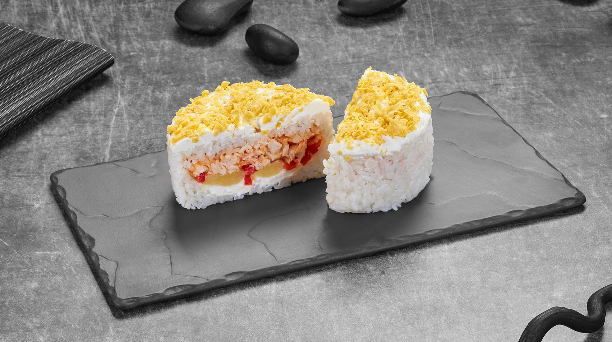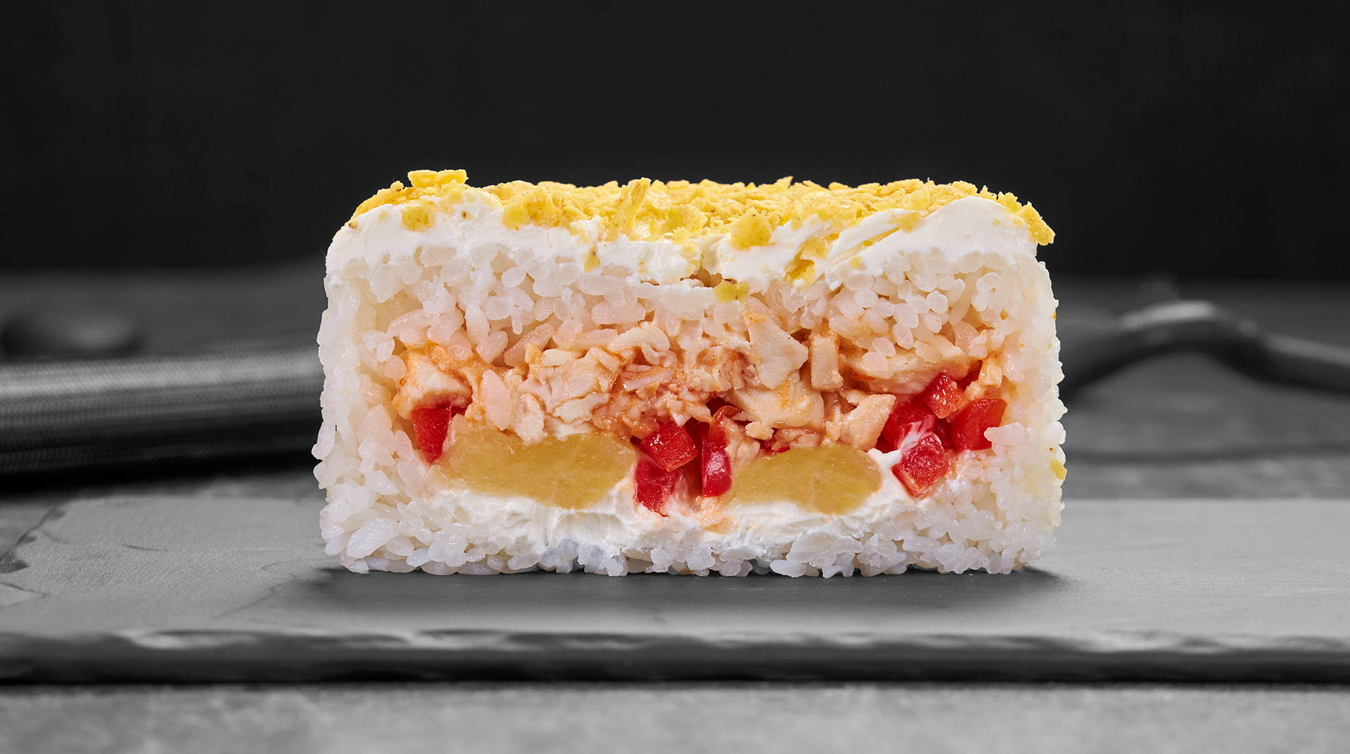 Состав: Курица, ананас, перец болгарский, соус сладкий чили, начос, сыр сливочный, рис