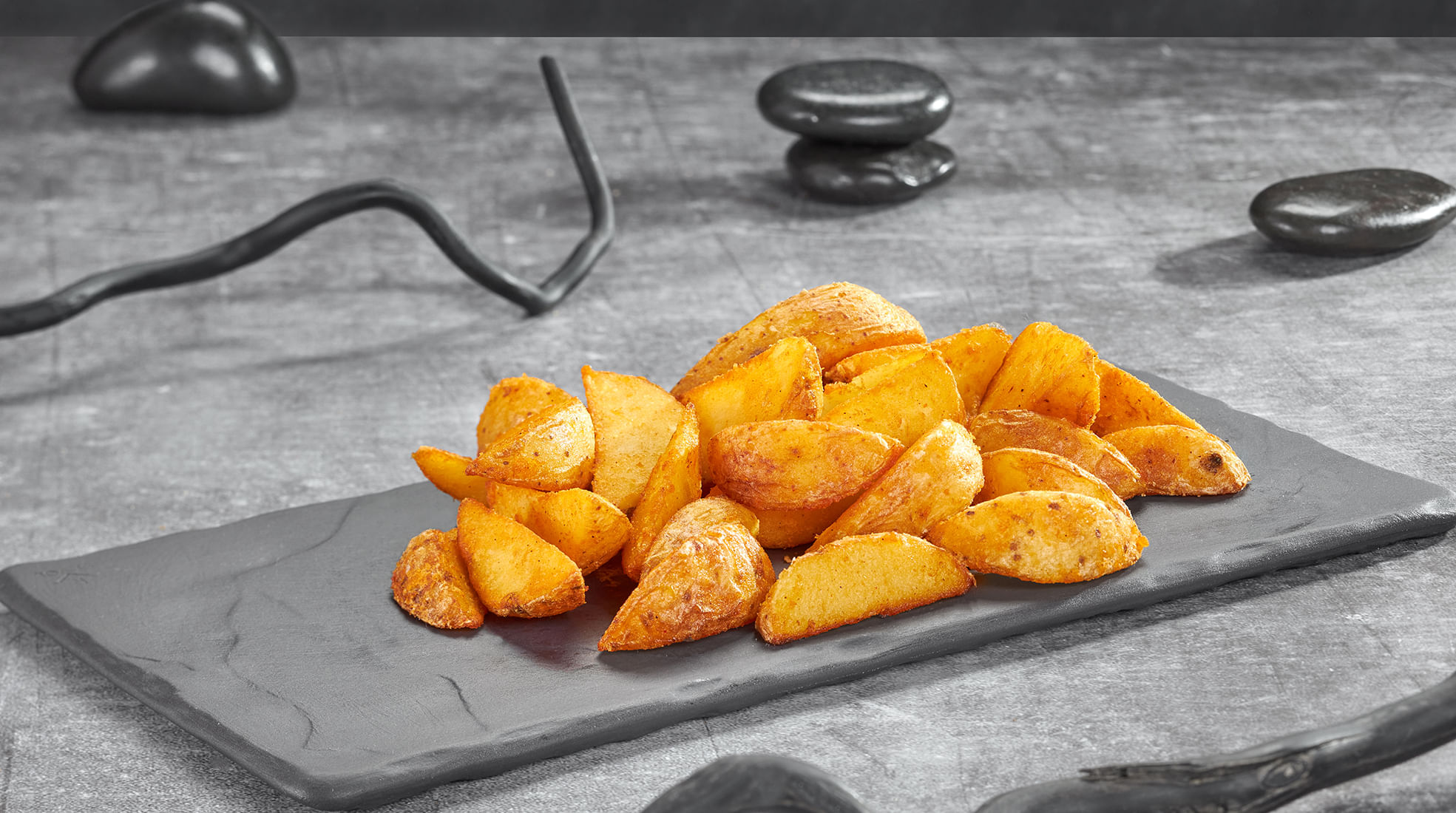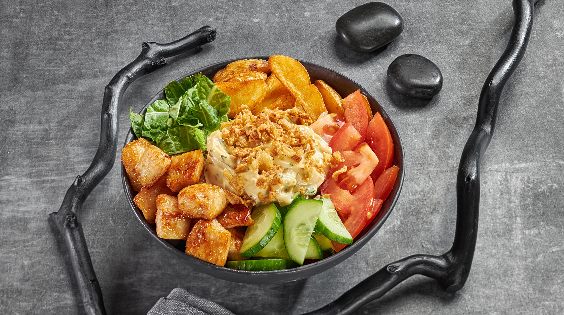 Курица, картофель айдахо, помидор черри, огурец, капуста пекинская, лук фри, соус майонезный