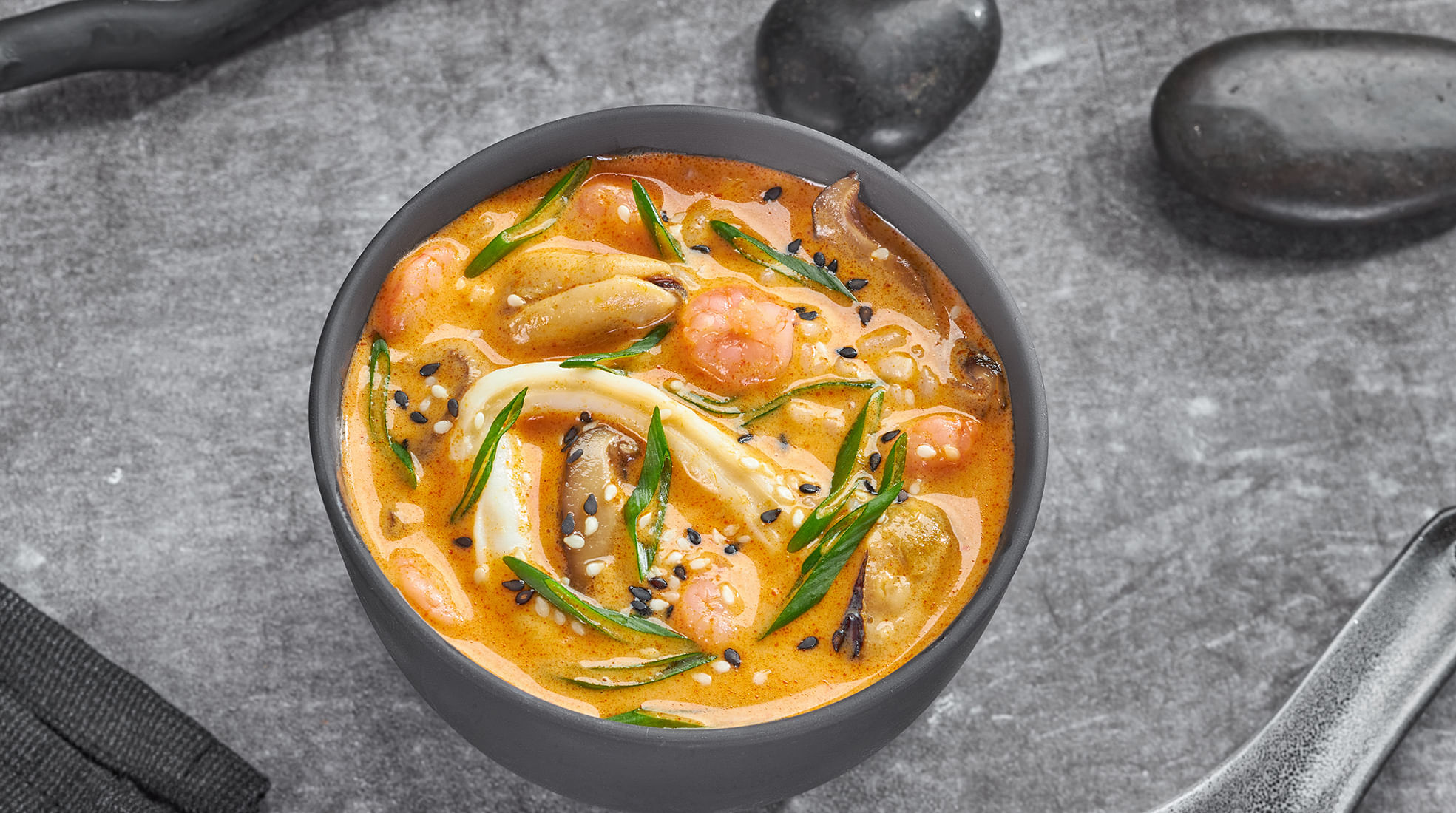 Курица, креветка, кальмар, грибы шиитаке, лук зеленый, кокосовое молоко, бульон том-ям, рис
