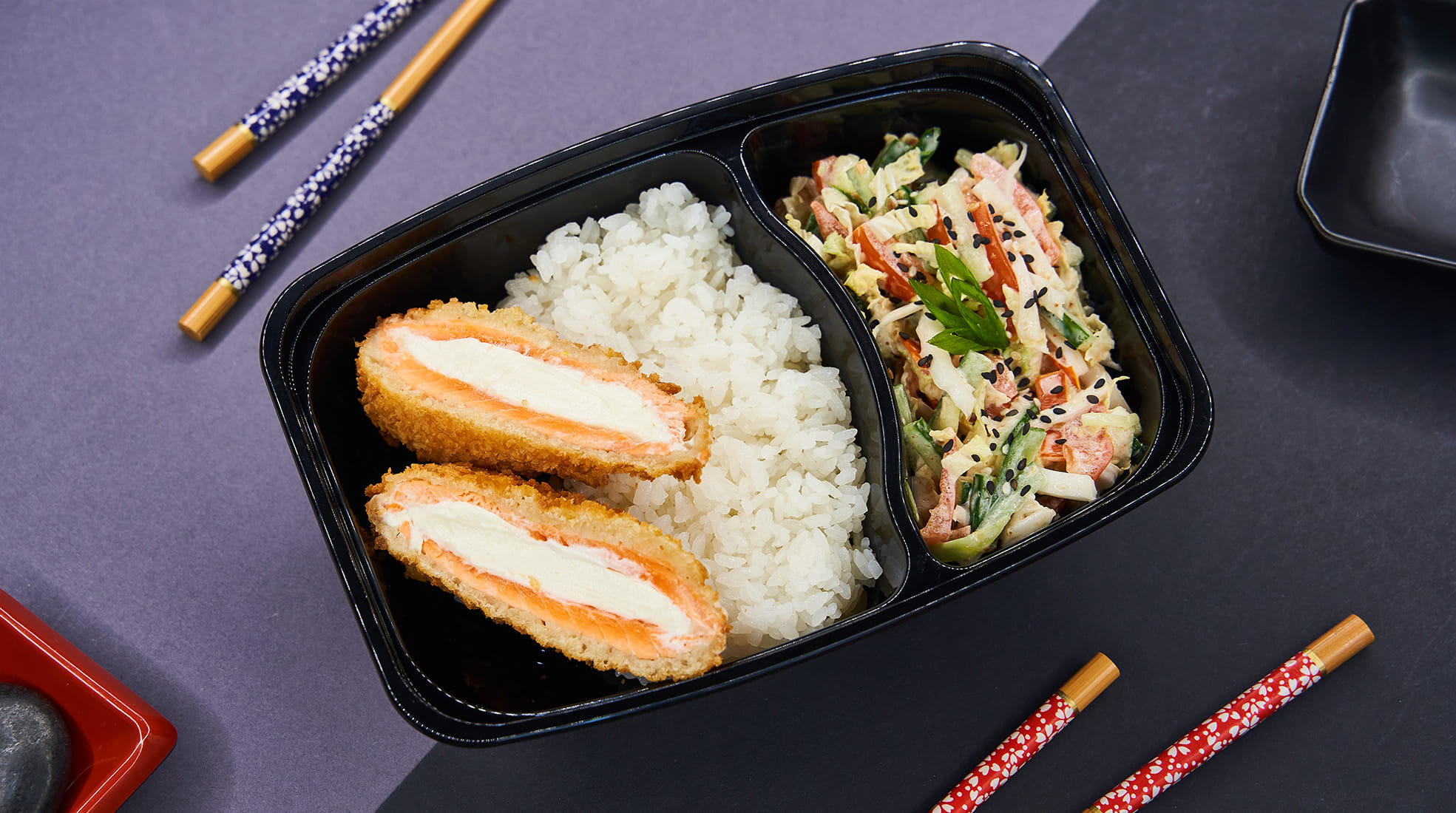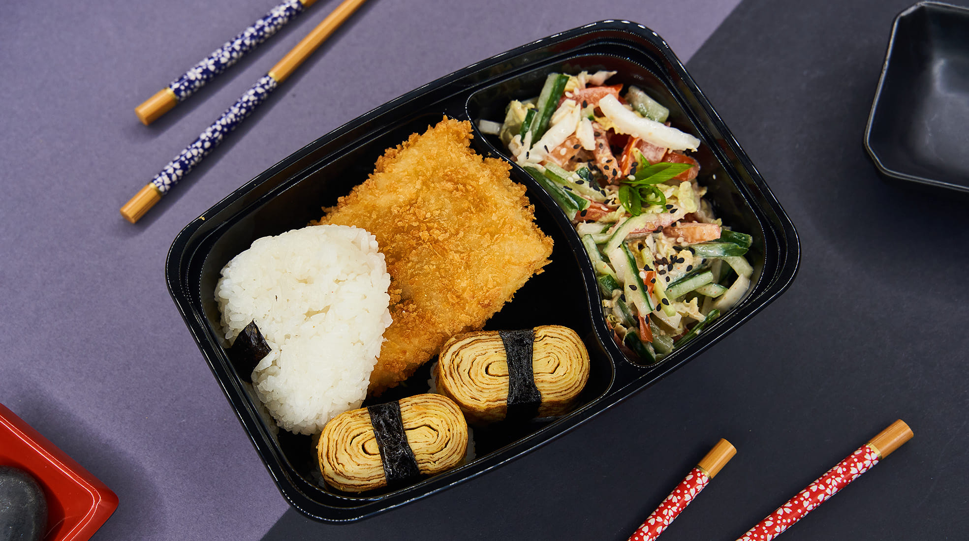 Тофу жареный в кляре, Онигири 1 шт, Тамаго нигири 2 шт, салат овощной, соус терияки