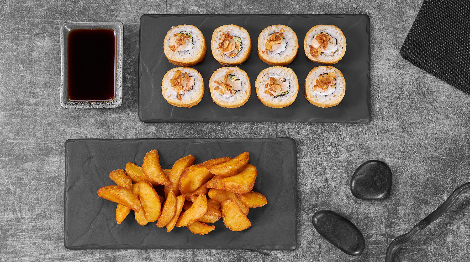 Если в жизни не хватает хруста, срочно вызывай команду спасения! Картофель Айдахо и ролл Чикен темпура уже надели свои лучшие золотистые панировки и спешат к тебе на помощь. Громко, вкусно и очень сытно ;)