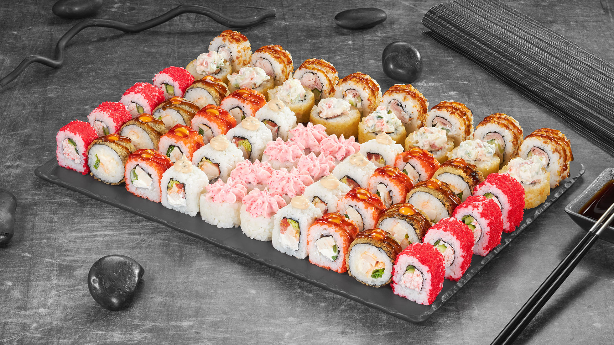 Состав: Дон бекон (8шт.), Острый с курицей (8шт.), Оливье темпура (8шт.), Калифорния классика (8шт.), Лава с лососем (8шт.), Темпурный с беконом (8шт.), Куритос (8шт.)