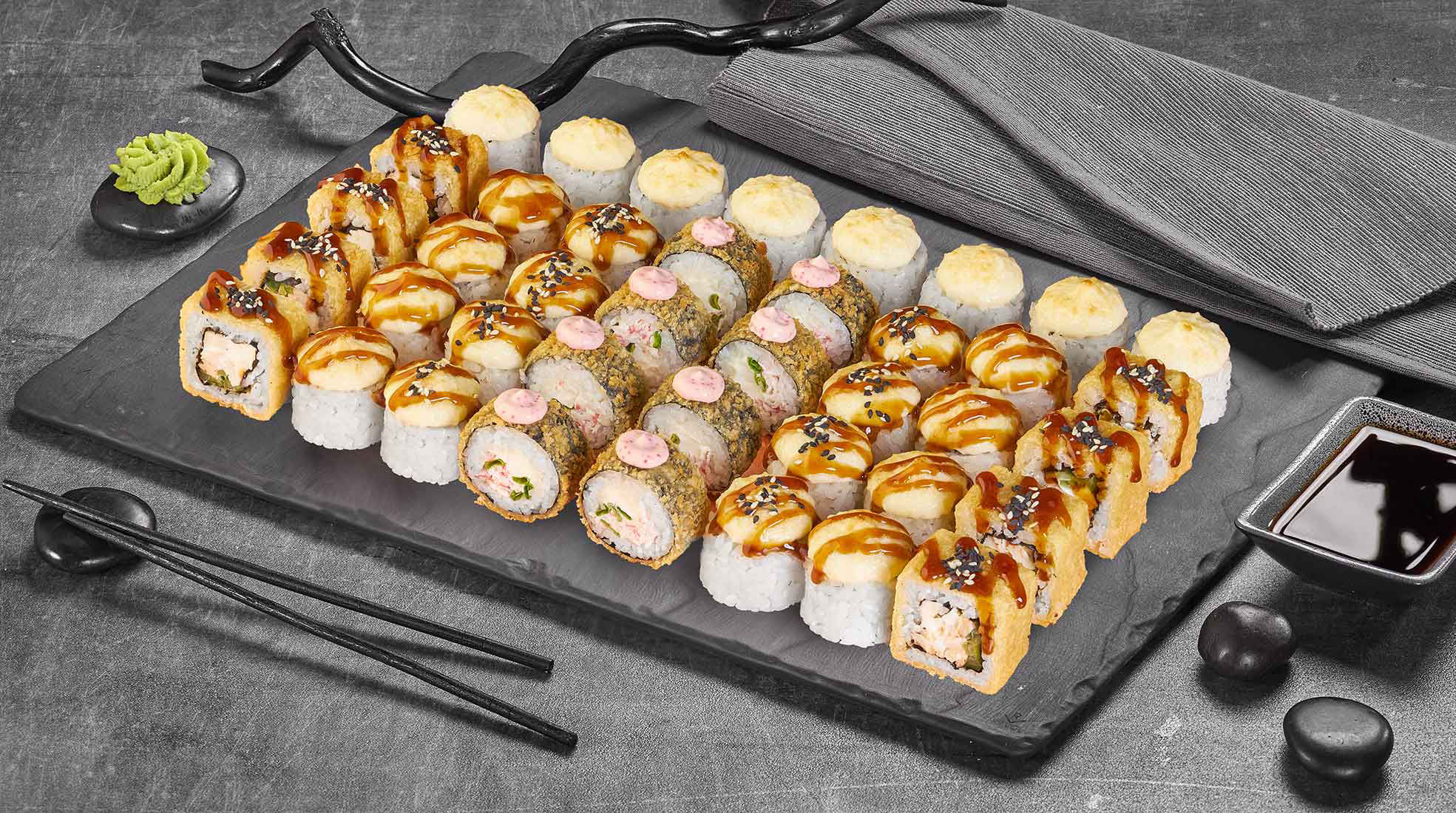 Состав: Кранч ролл с курицей (8шт), Краб фри темпура (8шт), Горячая креветка (8шт), Нежный с лососем (8шт), Цезарь ролл (8шт).