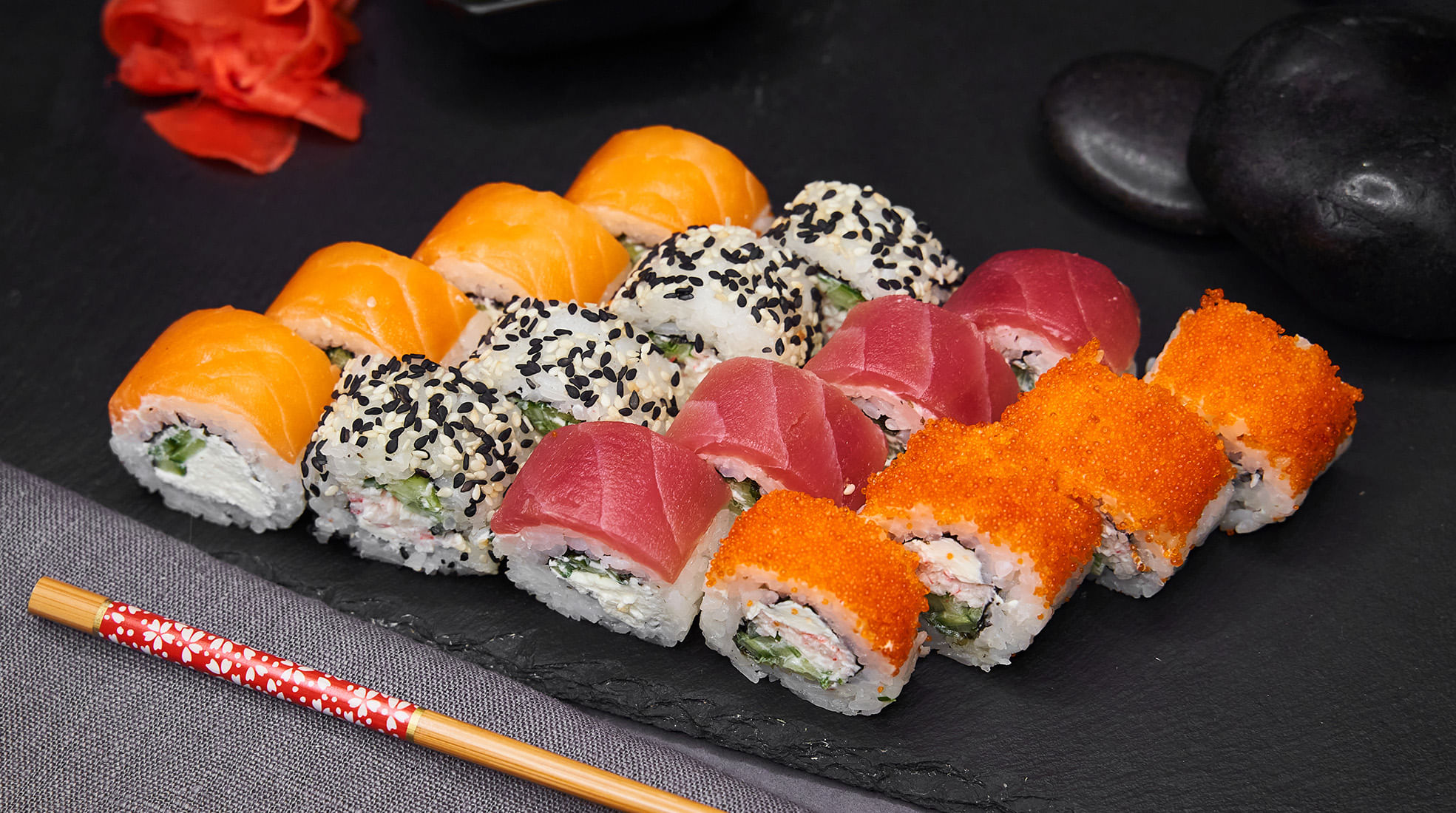 Состав: Филадельфия лайт сяке (4шт.), Филадельфия лайт магуро (4шт.), Калифорния лайт краб-микс (4шт.), Калифорния в кунжуте (4шт.)