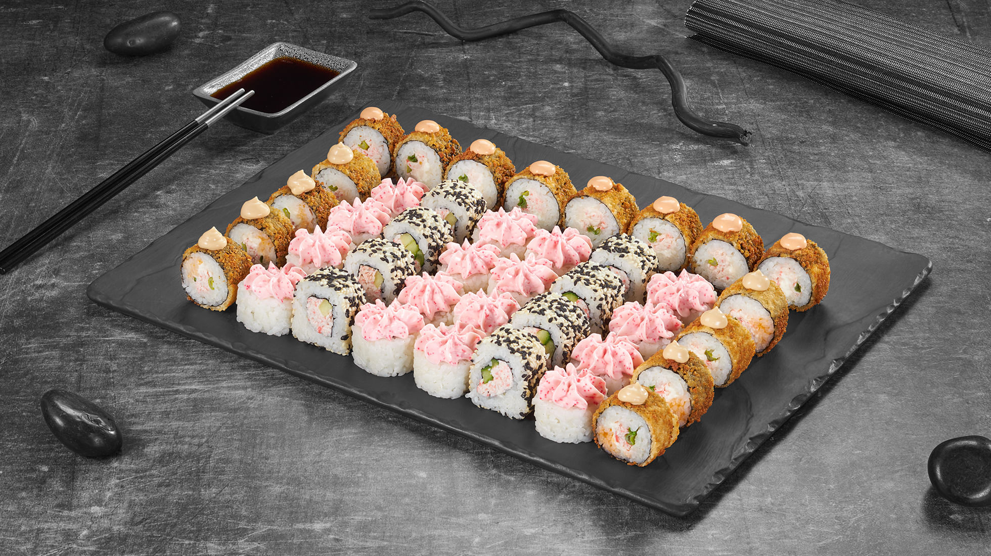 Состав: Филадельфия темпура (8шт.), Крабстер темпура (8шт.), Лава с крабом (8шт.), Лава с лососем (8шт.), Калифорния в кунжуте (8шт.)