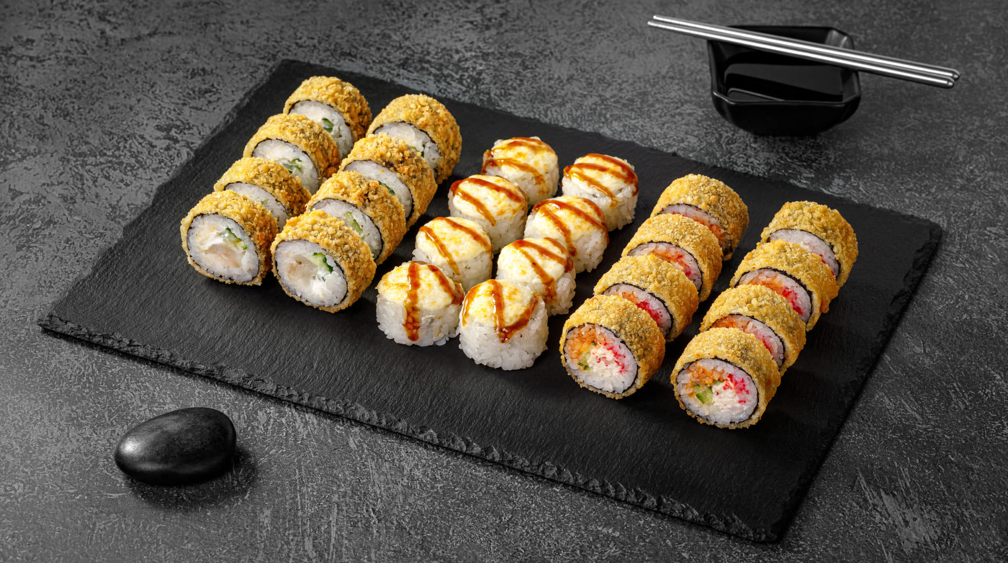 Состав: Нежный с курицей (8шт.), Калифорния темпура (8шт.), Фила темпура с окунем (8шт.)