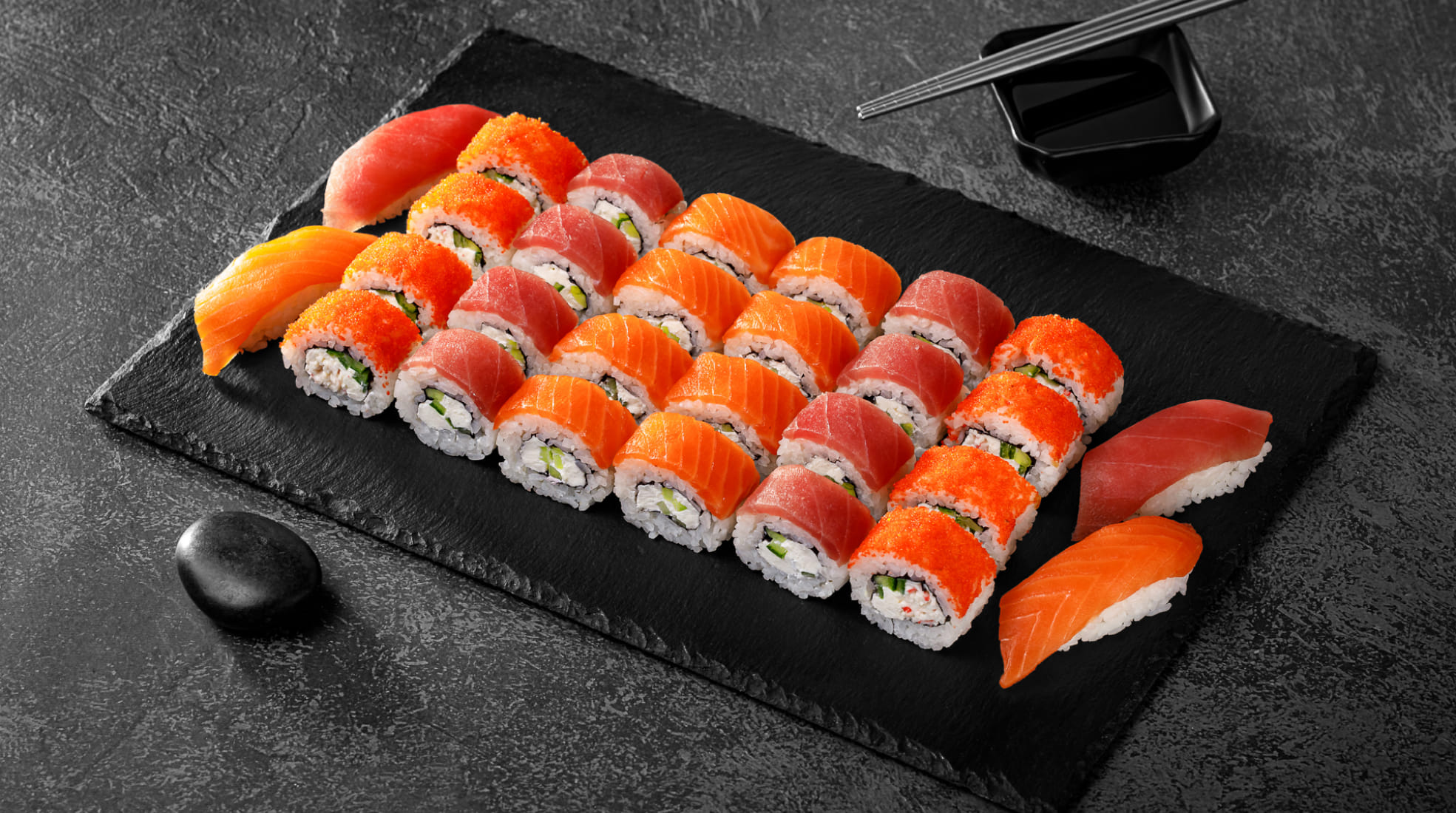 Состав: Филадельфия лайт сяке (8шт), Филадельфия лайт магуро (8шт), Калифорния лайт краб-микс (8шт), Сяке нигири (2шт), Магуро нигири (2шт).