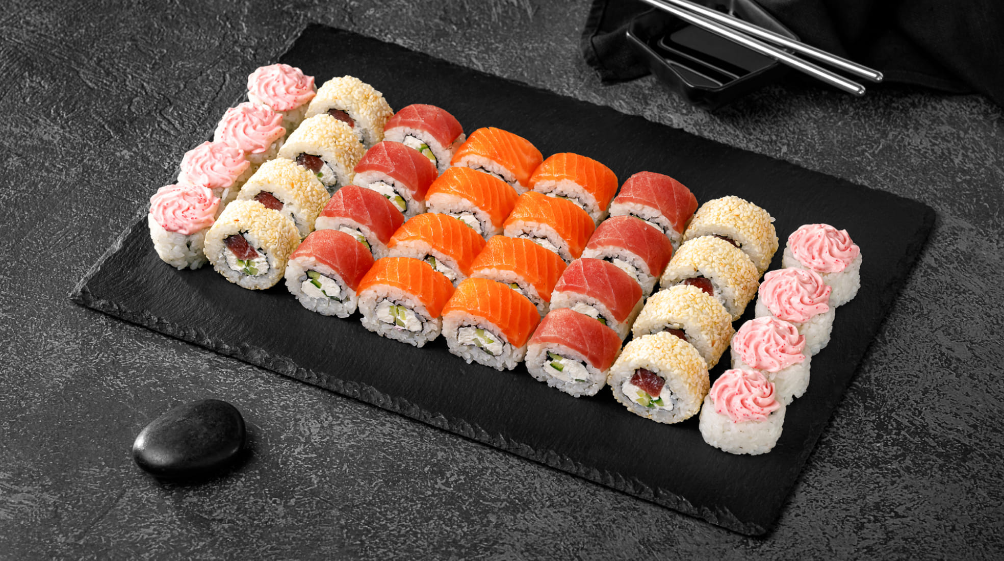 Состав: Сезам с тунцом (8шт), Филадельфия лат сяке (8шт), Филадельфия лайт магуро (8шт), Лава с лососем (8шт).