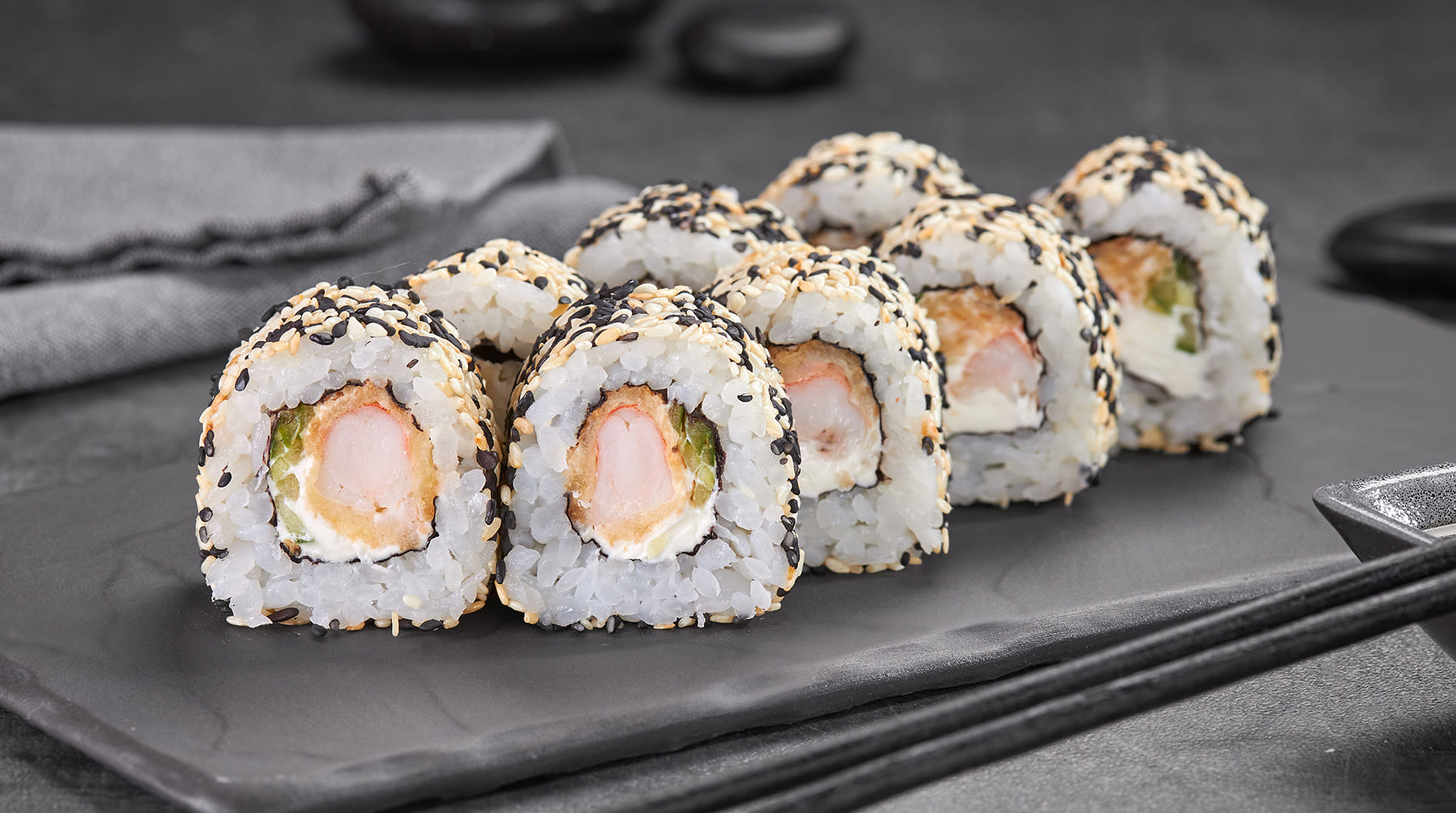 Состав: Креветка в темпуре, рис, сливочный сыр, огурец, кунжут, нори