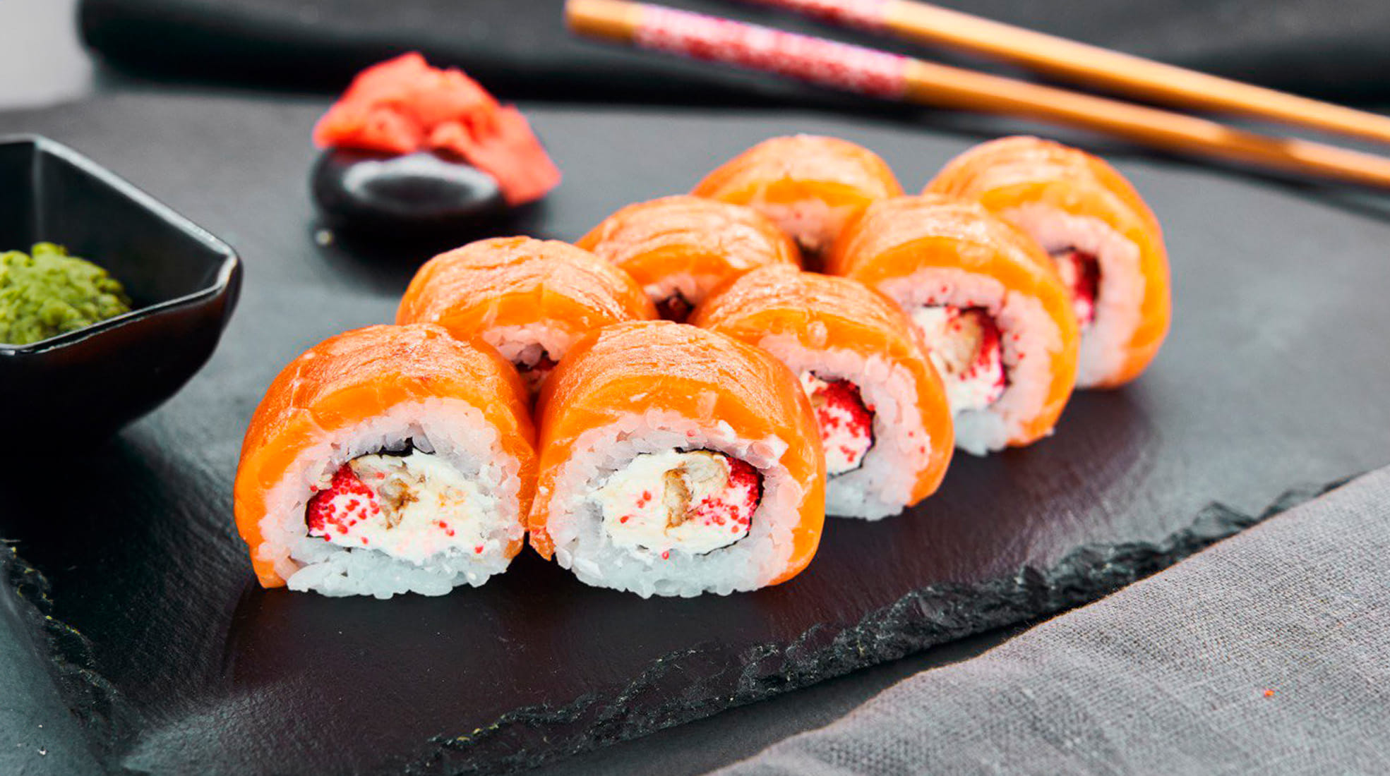 Состав: Лосось, сливочный сыр, угорь, икра тобико , рис, нори