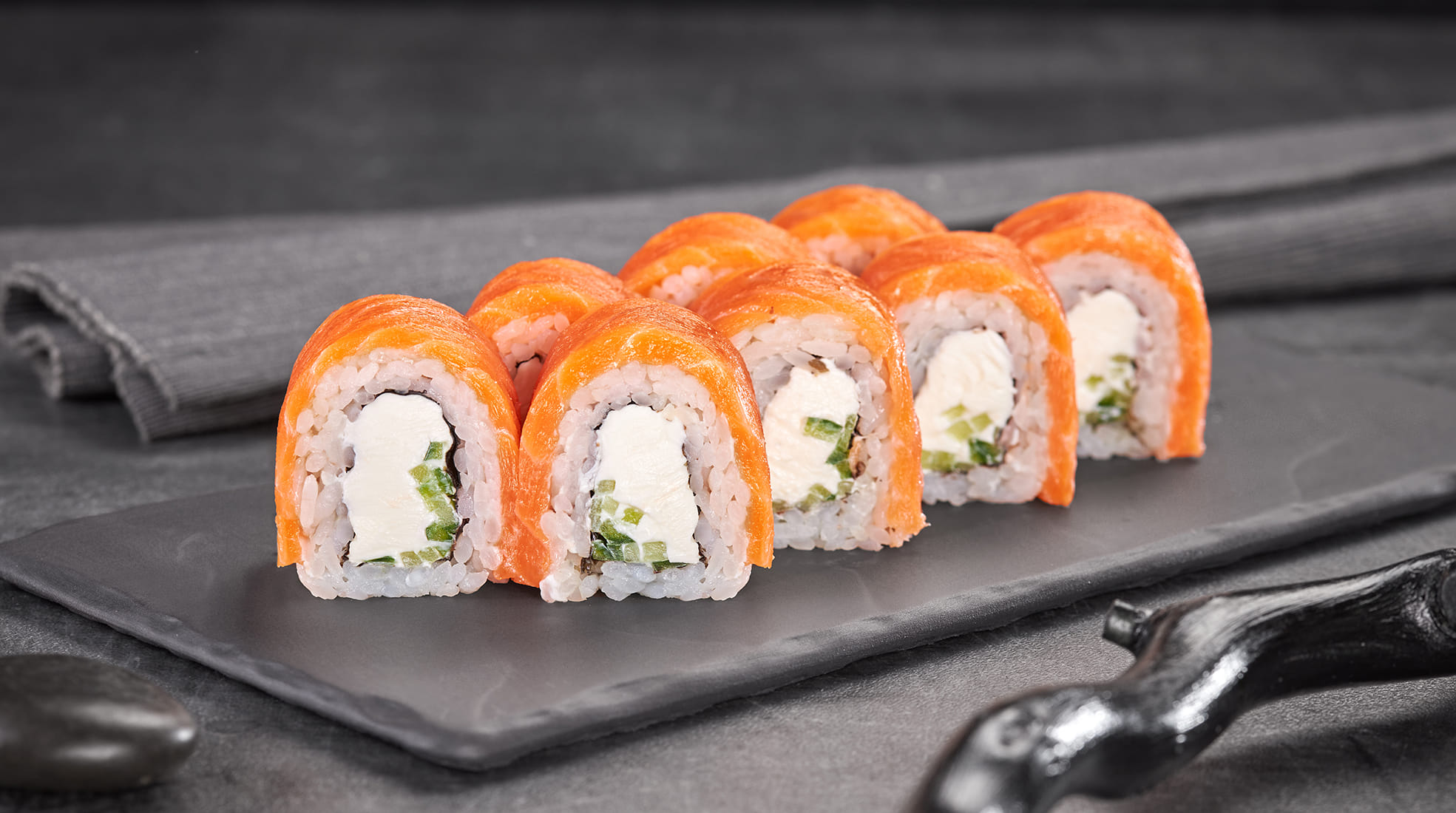 Состав: Лосось, сливочный сыр, огурец, рис, нори