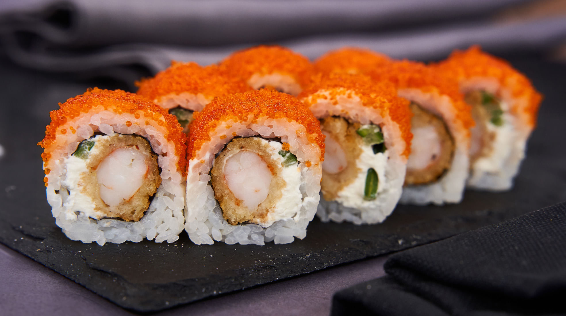 Состав: Икра тобико, огурец, креветка панко, сливочный сыр, рис, нори