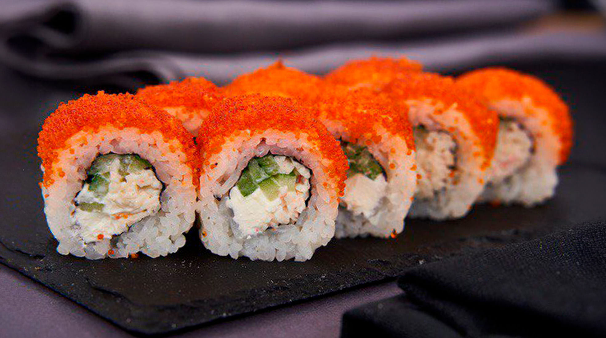 Состав: Икра тобико, замес краб-микс, огурец, сливочный сыр, рис, нори