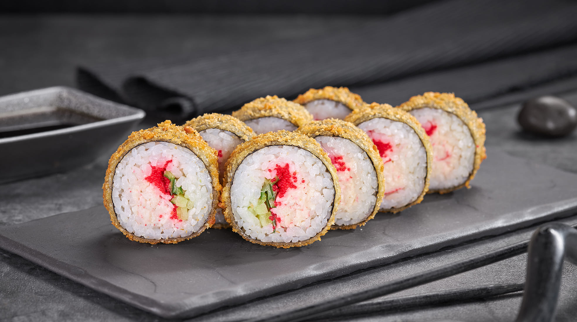 Состав: Замес краб-микс, рис, огурец, икра тобико, соус спайси, кляр, сухари панко, нори