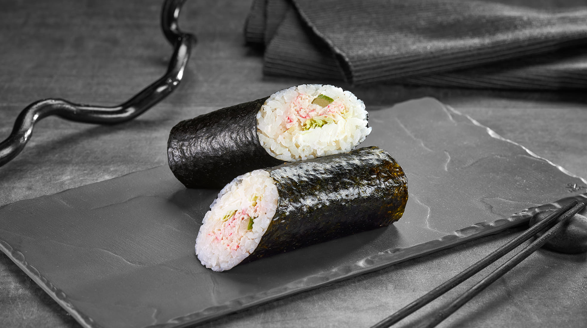 Состав: Замес краб-микс, сыр сливочный, рис, огурец, капуста пекинская, соус спайси, нори