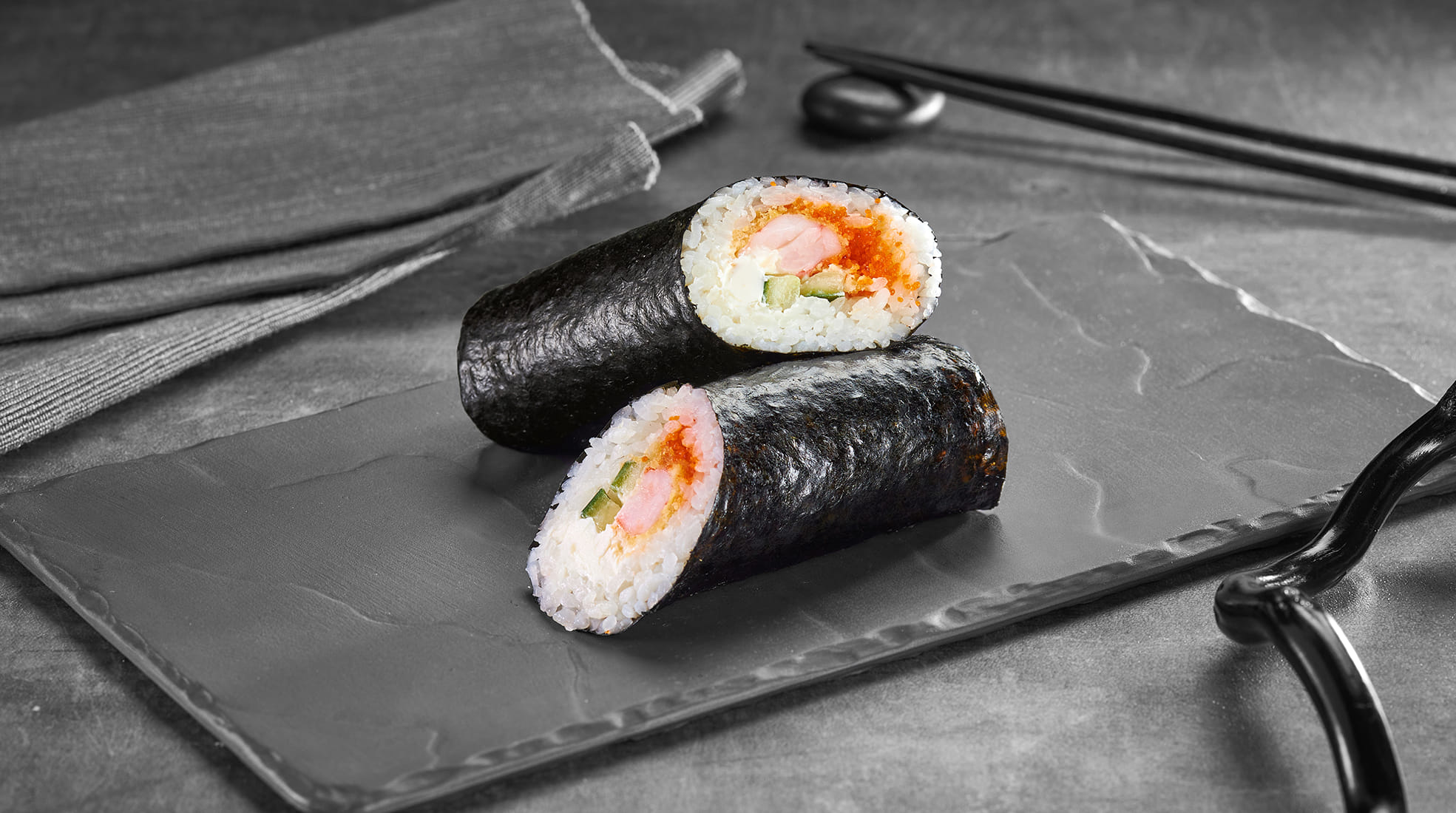 Состав: Креветка в темпуре, рис, икра тобико, сливочный сыр, огурец, нори