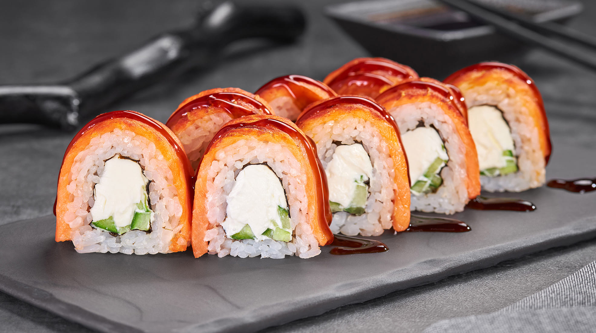 Состав: Лосось, рис, сливочный сыр, огурец, соус унаги, нори