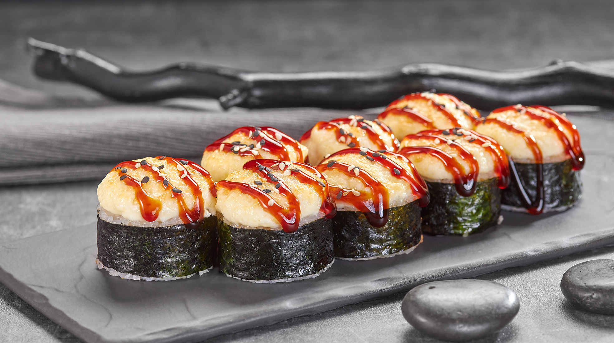 Состав: Лосось терияки, омлет тамаго, огурец, соус спайси, соус монако, соус унаги, кунжут, рис, нори