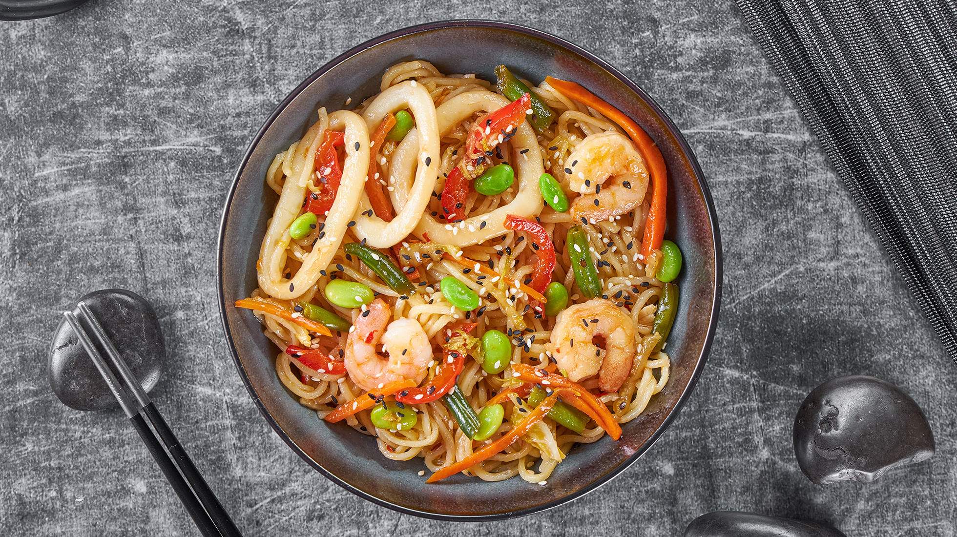 Креветка, кальмар, овощи микс, бобы эдамаме, лапша рамен, сладкий чили соус, терияки соус, микс имбирь-чеснок, кунжут, подсолнечное масло