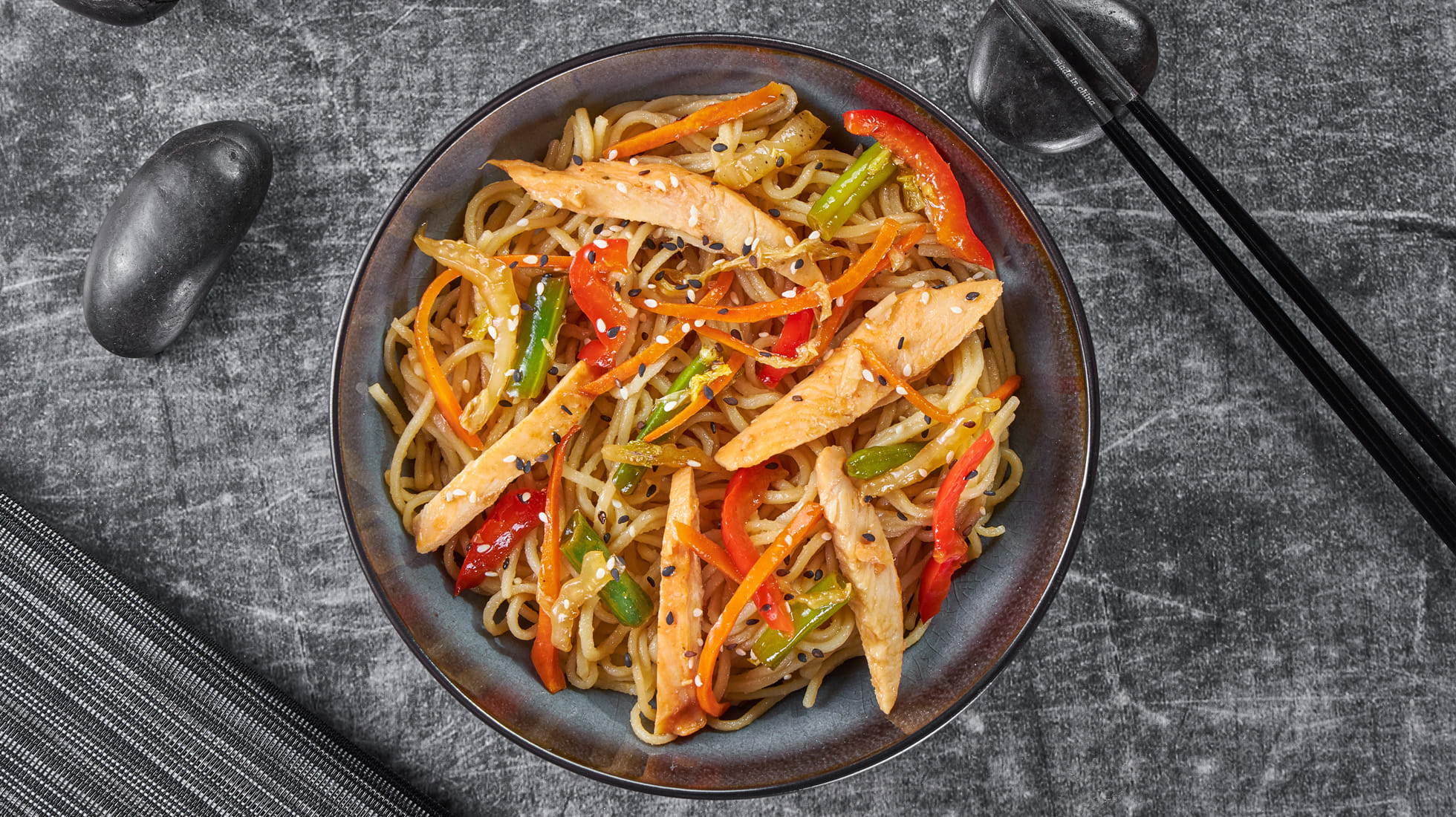 Состав: Курица, овощи микс, лапша рамен, терияки соус, кунжут, микс имбирь-чеснок, подсолнечное масло.