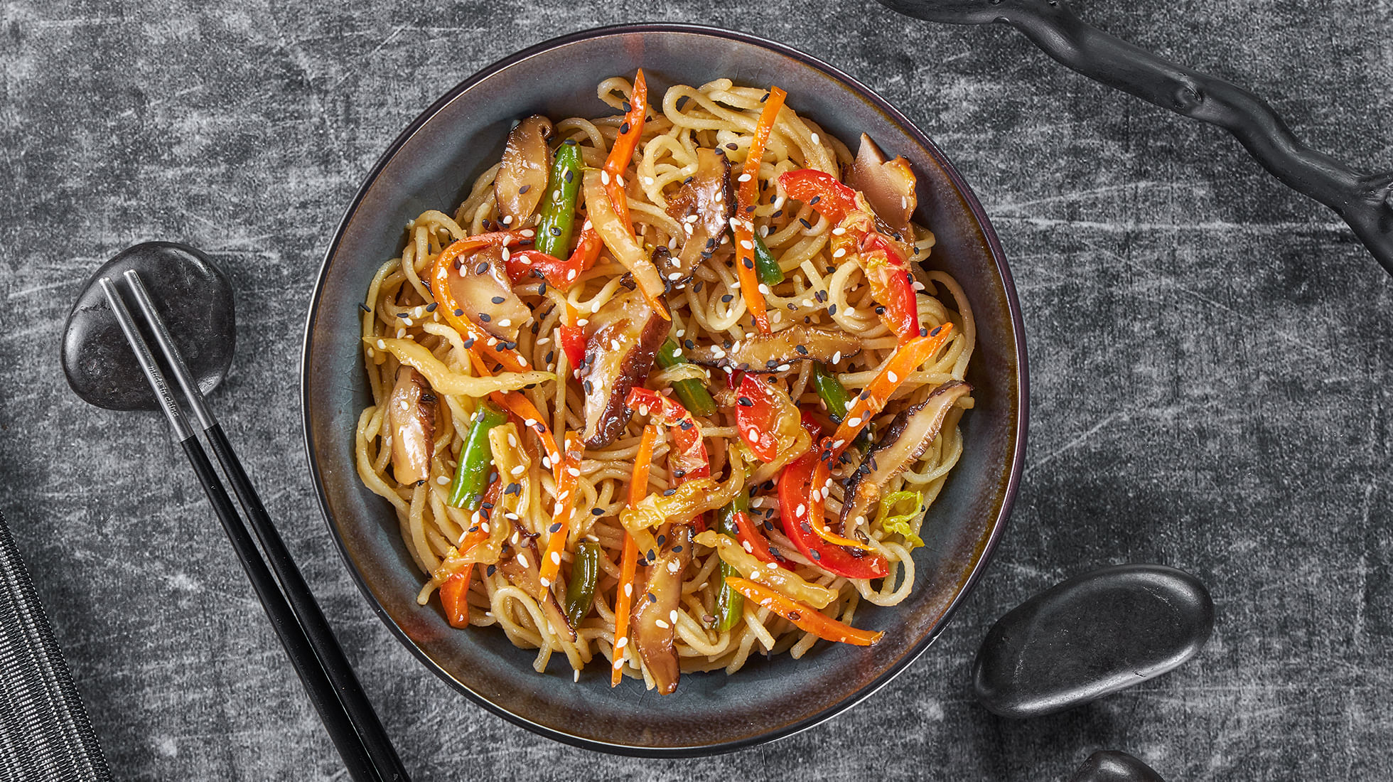 Состав: Грибы шиитаке, овощи микс, лапша рамен, терияки соус, кунжут, микс имбирь-чеснок, подсолнечное масло