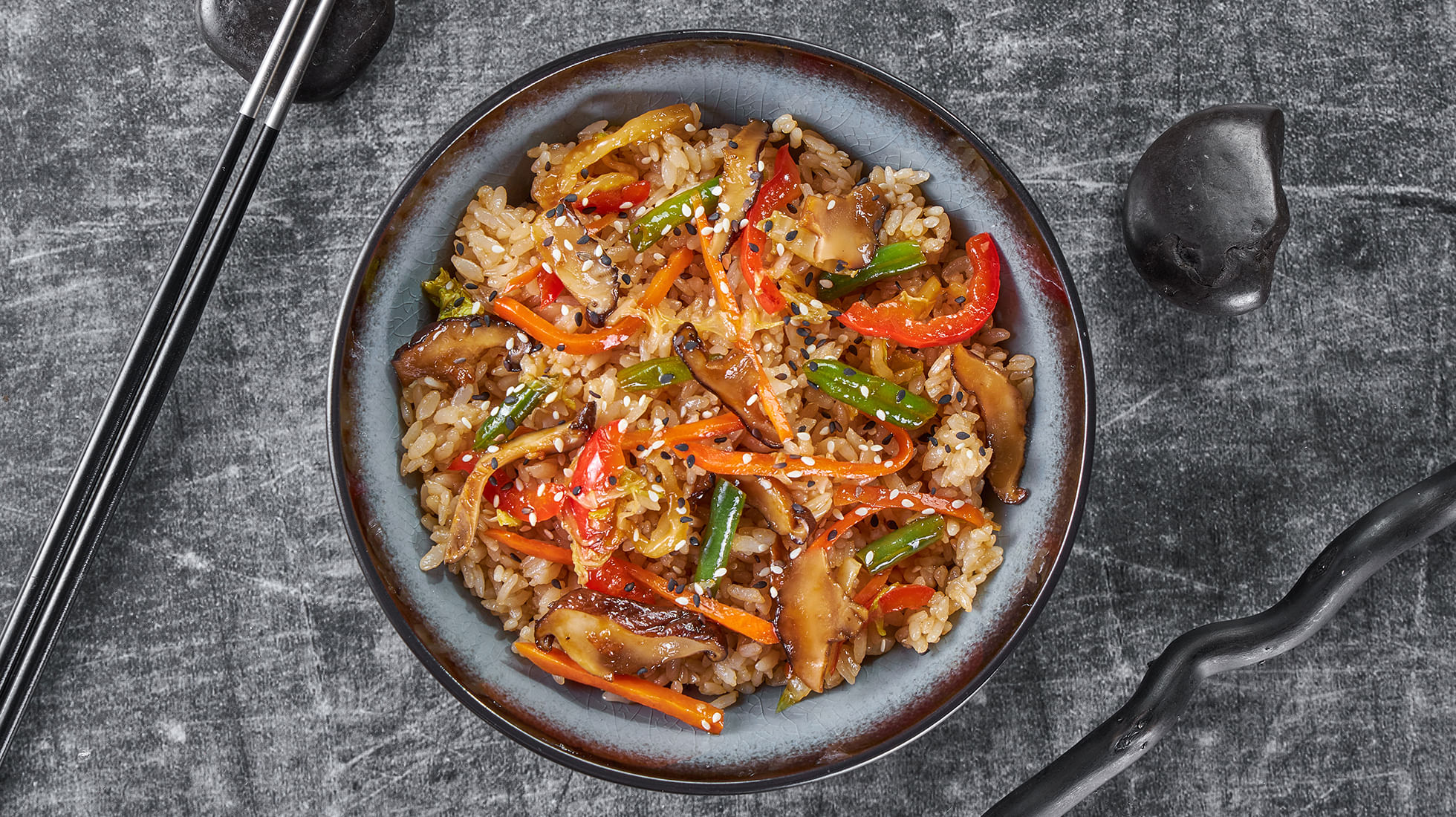 Состав: Грибы шиитаке, овощи микс, рис гохан, терияки соус, микс имбирь-чеснок, кунжут, подсолнечное масло